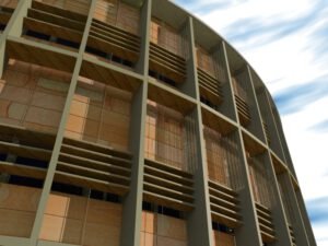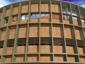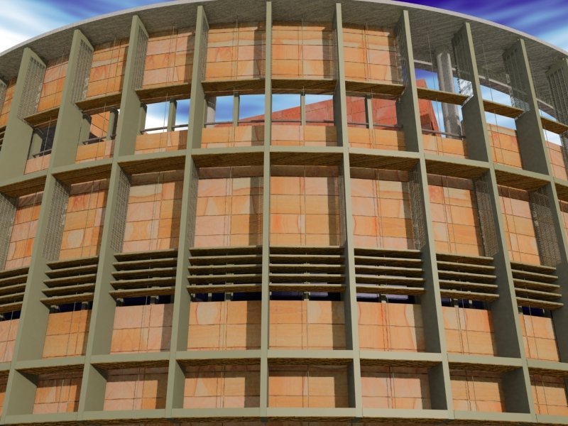 En la parte cilíndrica del edificio no se puede hablar en esencia de orientación según un plano, sino de un continuo que evoluciona de sur a norte y luego de nuevo a sur, teniendo iguales características geométricas solares a este y a oeste. En este sentido, como criterio general de diseño se propone que la parte de fachada más a norte sea muy cerrada y que se abra gradualmente según evoluciona hacia el sur, aumentando la superficie de acristalamiento. Esta gradación de fachada se aprecia también de manera muy distintiva en los parasoles verticales y horizontales, diseñados para bloquear la incidencia solar directa desde el 21 de marzo al 21 de septiembre. Por esta razón los parasoles horizontales son pocos en el frente sur, muy profusos hacia el este y el oeste, y prácticamente inexistentes (salvo por razones de continuidad formal) al norte. Los parasoles o aletas verticales se mantienen en todo el perímetro.
