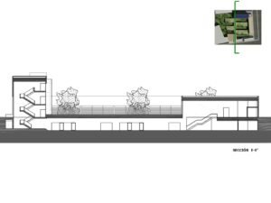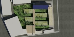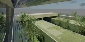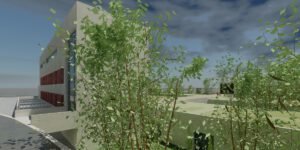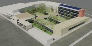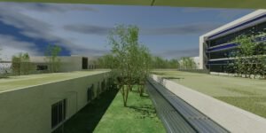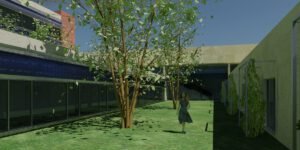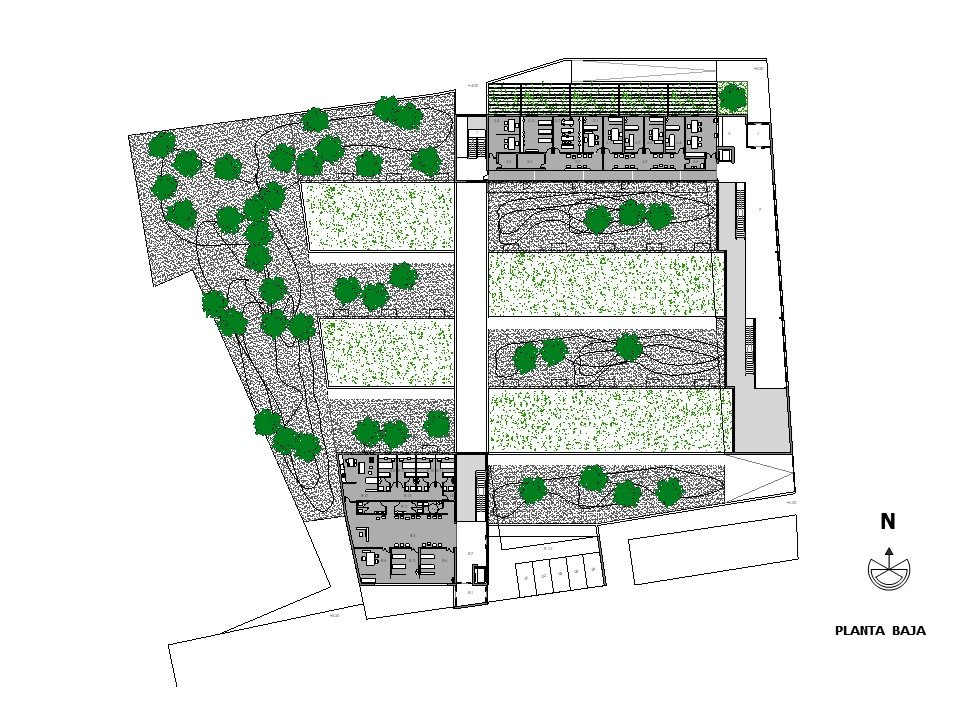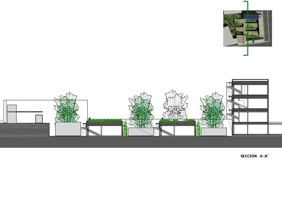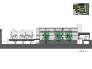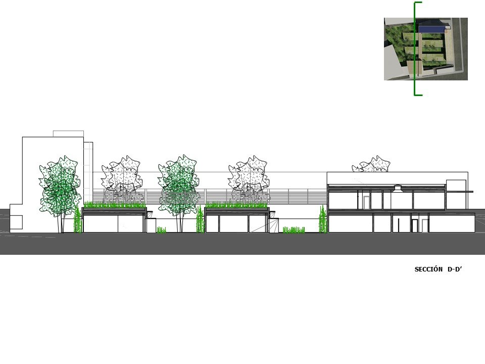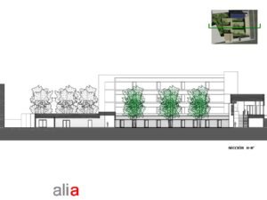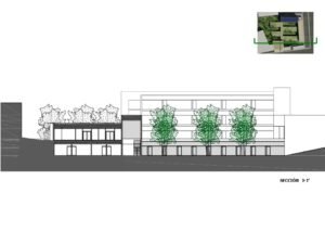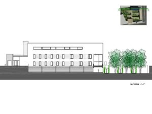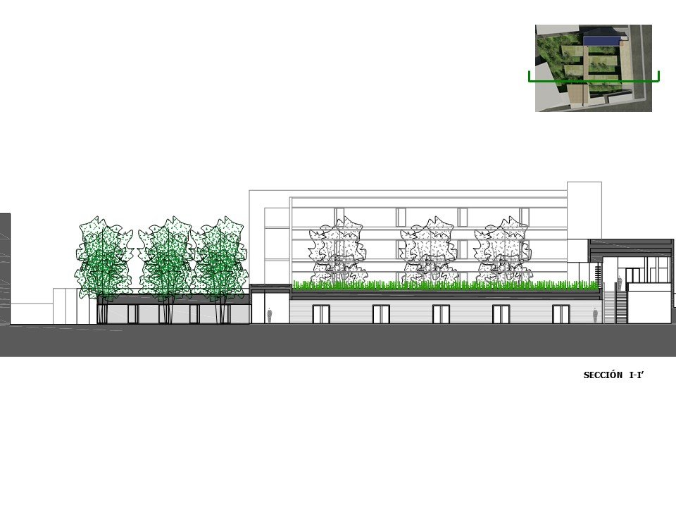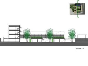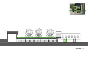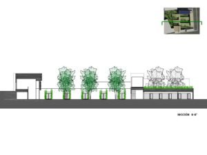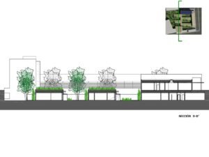– Árboles de hoja caduca de gran porte. Se ubican en los patios de expansión de las consultas, en la planta sótano – que es la rasante actual del terreno -. Estos árboles contribuirán al sombreamiento de las edificaciones en el periodo veraniego y dado que son de hoja caduca permitirán la incidencia solar en la época invernal entre equinoccios. Como estrategia complementaria a esta se propone el aprovechamiento de los árboles existentes en la parcela, reubicando aquellos que se verán afectados por las edificaciones.