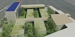 – Cubiertas ajardinadas. Estarán plantadas con especies tapizantes autóctonas tales como tomillo, romero, lavanda y jara, las cuales tienen baja demanda de riego . La evaporación de agua en la temporada estival permite bajar de forma local la temperatura. Como estrategia sostenible complementaria se propone un sistema de riego por goteo que además estará apoyada en verano por la reutilización de las aguas grises generadas en los lavamanos de las consultas; éste agua servirá también para el riego del resto de especies vegetales de la edificación.