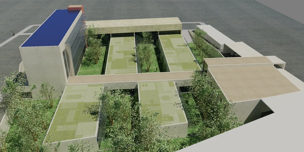 El edificio se genera partiendo de creación de los pabellones de consultas alternados con jardines interiores, dispuestos en una orientación Este-Oeste pura que permite que las fachadas largas tengan orientaciones Norte-Sur que facilitarán la ganancia solar y las ventilaciones cruzadas cuando sea preciso.