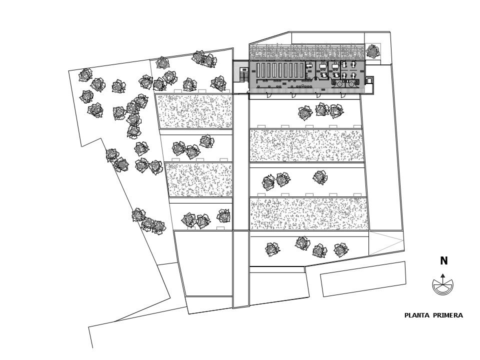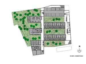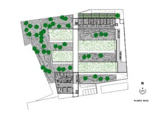 La primera preocupación ha sido ordenar el ámbito de la intervención favoreciendo la buena orientación solar de las edificaciones y conseguir un entorno “natural”. Se ha aprovechado la rasante natural del solar, que es plana y deprimida respecto a los viales del entorno, para crear un Centro de Salud volcado al interior y con una urbanización de patios cultivables que creen un ambiente saludable y favorezca el uso del inmueble en un entrono grato. En ese sentido se ha dado especial importancia a relación de los espacios de espera de los pacientes con los patios ajardinados, creando espacios de estancia que en determinadas épocas del año puedan expandirse usando los jardines interiores.