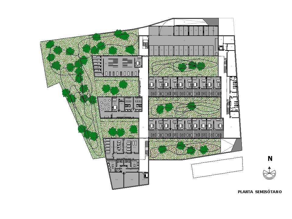 Así entendido los espacios relacionados con el uso principal de atención sanitaria del edificio se disponen en la planta sótano, que realmente es una planta a cota de la rasante de la parcela. Se ha concebido como prioritario que las zonas de circulación y espera de cada pabellón de consultas esté relacionado con un patio ajardinado que le servirá de expansión espacial y visual y de regulador climático. Complementariamente a esta misma cota y en el extremo norte de la parcela se dispone el espacio de estacionamiento de vehículos, el cual estará cubierto pero no cerrado. Se ocultará del exterior y del resto del edificio con el uso de celosías y de una pérgola ajardinada.