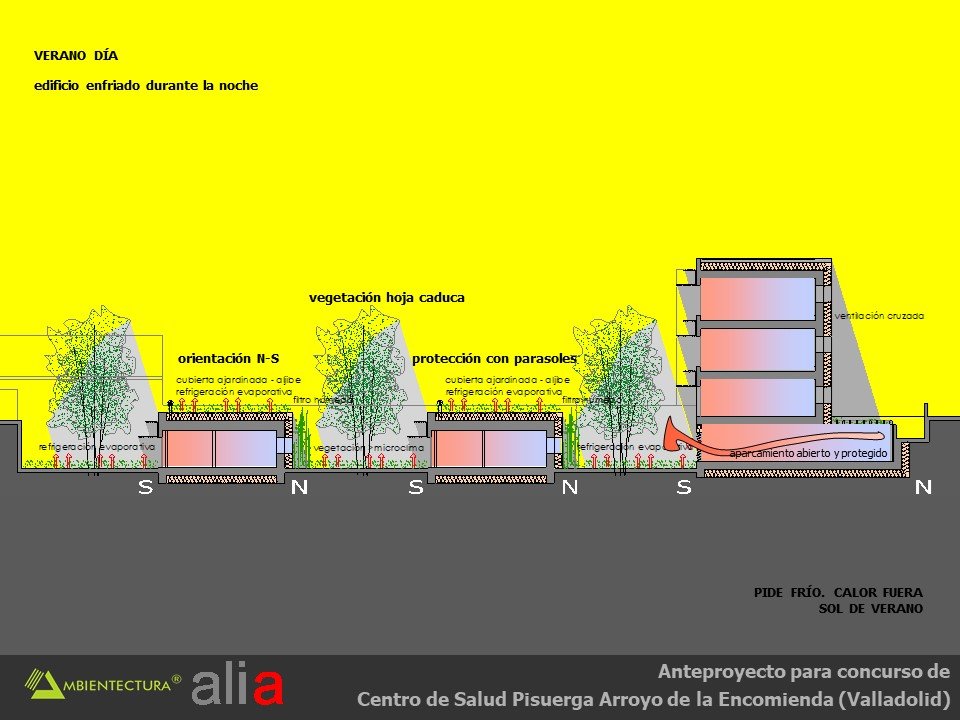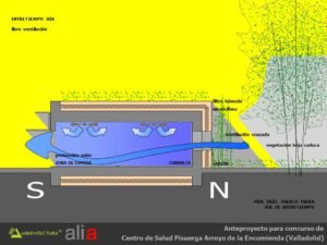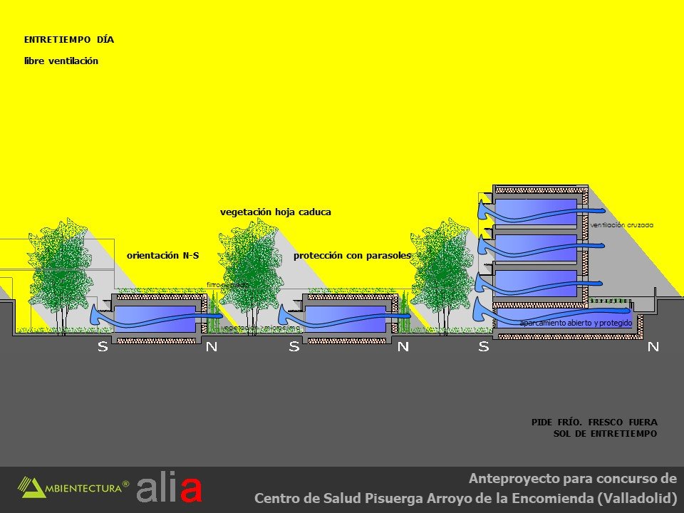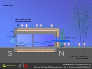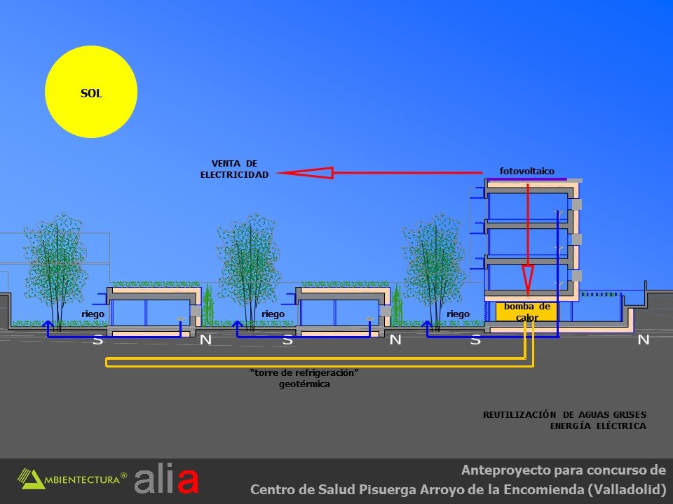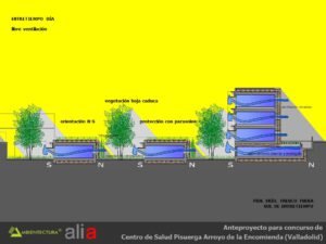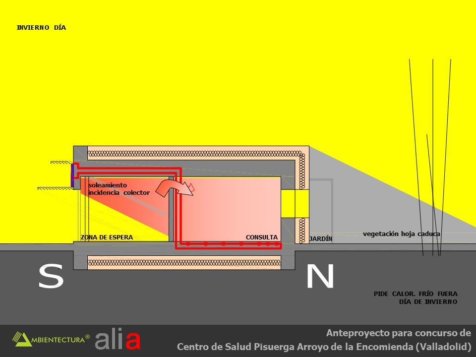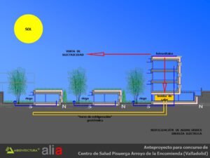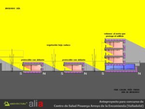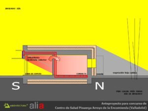 - Distribución interior basada fundamentalmente en suelo radiante, tanto para calentamiento como para refrescamiento y con alimentación directa de captadores solares dispuestos en las fachadas sur de las consultas y del bloque de administración. Los captadores solares estarán dispuestos en vertical y con un parasol de lamas orientadas de tal forma que el sol sólo incidirá perpendicularmente a ellos en la temporada entre el 21 de septiembre y el 21 de marzo, periodo en el que puede existir demanda de calefacción. Esta forma de usar los captadores solares acrecienta su durabilidad dado que en verano están sombreados y no tienen por tanto que soportar los problemas derivados del soleamiento excesivo.
