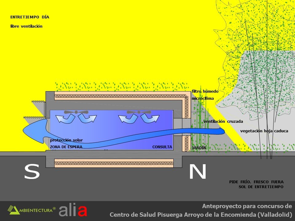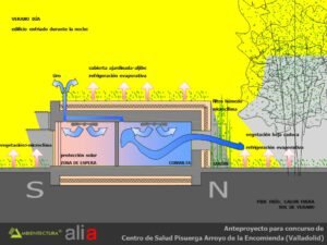 – Filtro húmedo en las ventanas de las caras norte de las consultas. Se trata también de un recurso de acondicionamiento higrotérmico de verano, consiste en disponer unos emparrados de plantas trepadoras de hoja caduca bordeando las ventanas norte. Mediante riego y vaporización se crea un descenso local de la temperatura introducido en el interior del inmueble a través de rejillas de ventilación. Gracias a la depresión generada por aspiradores dinámicos situados en la cubierta ese aire circula por la edificación refrescándola.