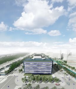 Servicios centrales que, aparte de los núcleos de comunicación vertical y los aseos,  incluyen el sistema principal de ventilación del edificio, consistente en dos pulmones (espacios acristalados que sirven como distribuidor de aire primario a baja velocidad a los espacios), dos patios con cubierta aislada y ciega que puede abrirse, y dos columnas de retorno de climatización.