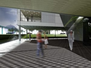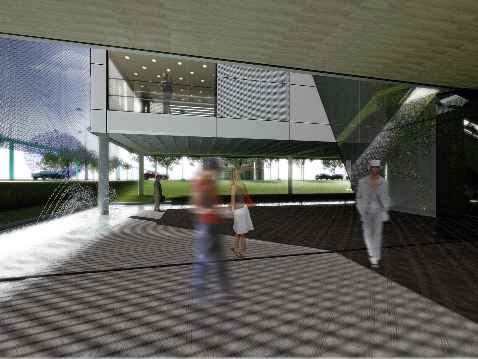 Plaza vegetada en semisótano para crear un ámbito fresco, desde el que toma aire el sistema de climatización, y para albergar los espacios más públicos del edificio.
