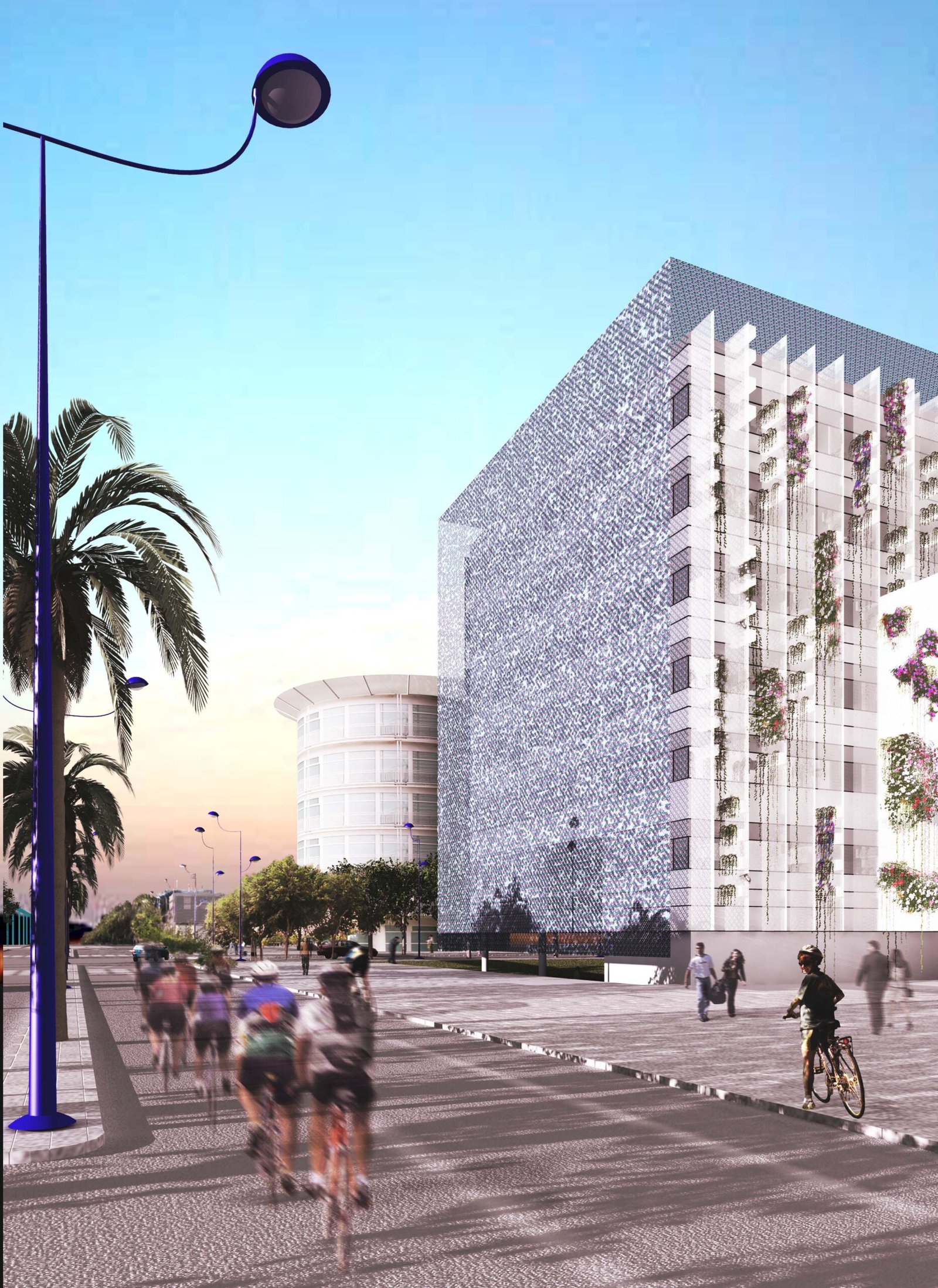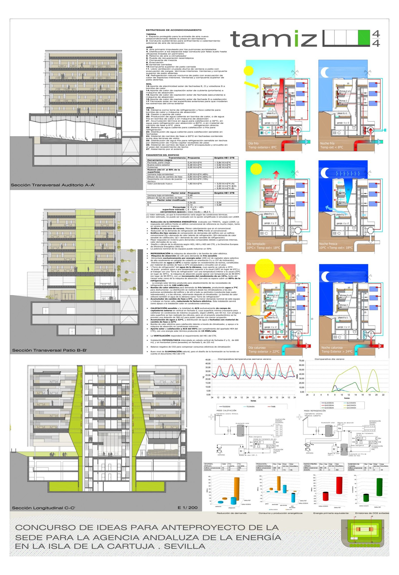 En orientación E y O se dispone una celosía formada por el cruce de líneas de captadores fotovoltaicos y de parasoles de chapa perforada en U, que aportan el soporte estructural. La función fundamental de estas celosías es aportar sombreamiento y energía eléctrica en verano, para la refrigeración por bomba de calor.