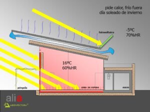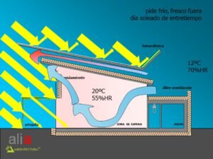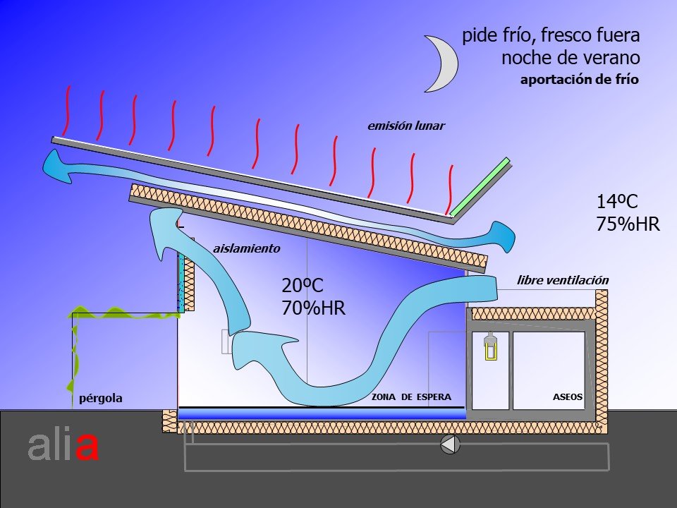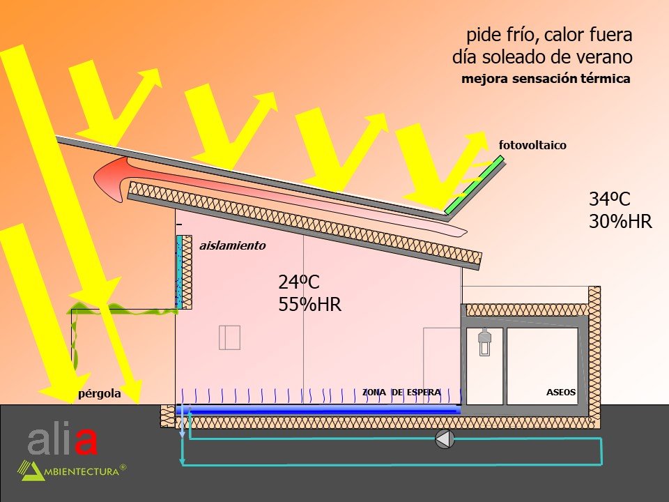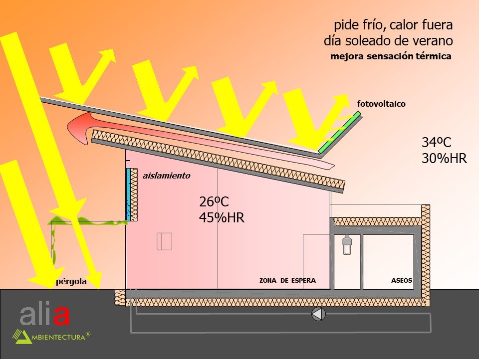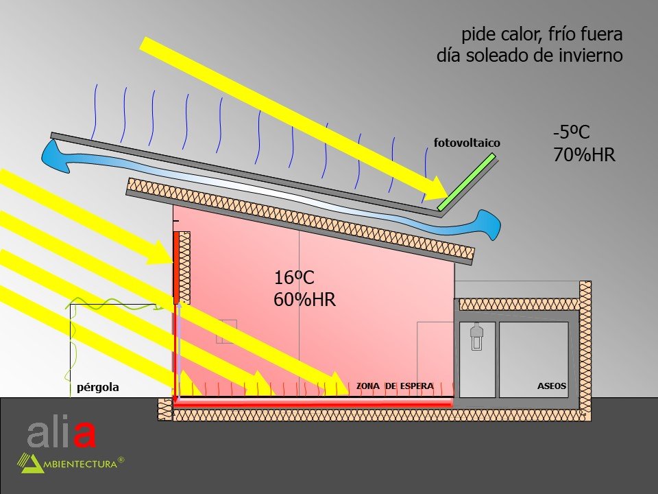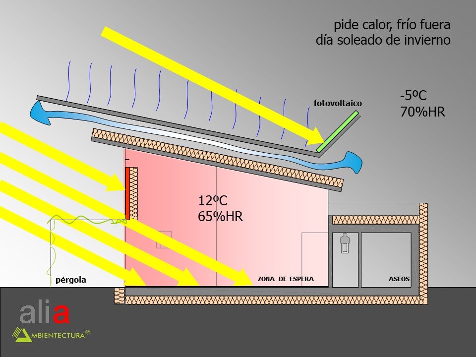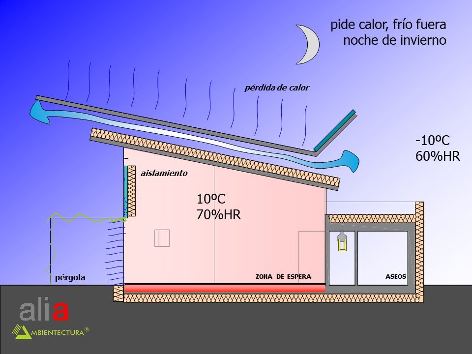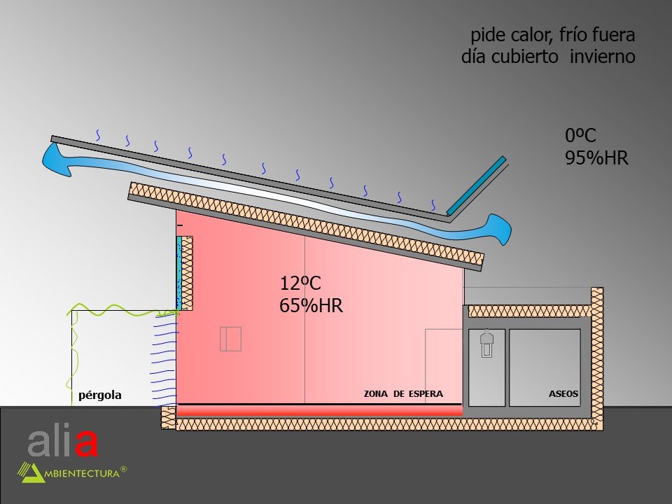 Las terminales de autobuses pueden entenderse como un caso clásico en la disciplina bioclimática: el del refugio, en el que lo que se busca es atemperar el clima exterior en cierta medida (que haga menos frío que fuera en invierno y que haga menos calor que fuera en verano).